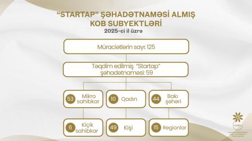 Bu ilin I yarısında İqtisadiyyat Nazirliyinin tabeliyindəki Kiçik və Orta Biznesin İnkişafı Agentliyi (KOBİA) 13 KOB subyektinə “Startap” şəhadətnaməsi verib.