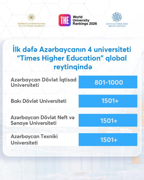 Ölkə tarixində ilk dəfə 4 universitetimiz “Times Higher Education” (THE) beynəlxalq reytinq agentliyi tərəfindən dərc olunan “Dünyanın ən yaxşı universitetlərinin reytinqi”nə (World University Rankings2026) daxil olub.