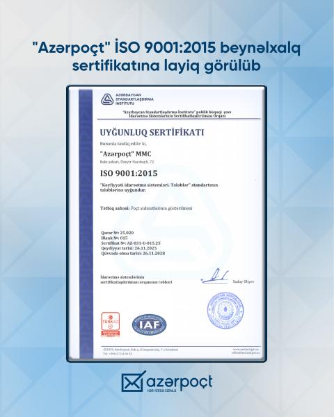 Bu sertifikat “Azərpoçt”un mükəmməlliyə doğru atdığı ardıcıl və inamlı addımının, həmçinin beynəlxalq keyfiyyət idarəetmə tələblərinə tam uyğunluğunun və müştəri məmnuniyyətinə verilən yüksək önəmin növbəti təsdiqidir.