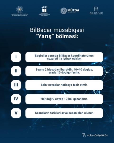 “Yarış” bölməsində şagirdlər “BilBacar” koordinatorunun nəzarəti altında iştirak edəcəklər. Seans eyni qaydada iki hissədən ibarət olacaq, səhv cavablar nəticəyə təsir etməyəcək və hər düzgün cavab 10 balla qiymətləndiriləcək. Seansların tarixləri əvvəlcədən elan olunacaq. Final mərhələsi əyani şəkildə, mərkəzləşdirilmiş formada keçiriləcək. Bu mərhələdə birinci mərhələnin nəticələri sıfırlanacaq və qaliblər müəyyən ediləcək. Məktəblər “Yüksək iştirakçılıq” və “Yüksək nəticə” (orta bal) nominasiyaları üzrə yarışacaqlar. Siniflərin nəticələri topladıqları balların ortalaması ilə müəyyən ediləcək.