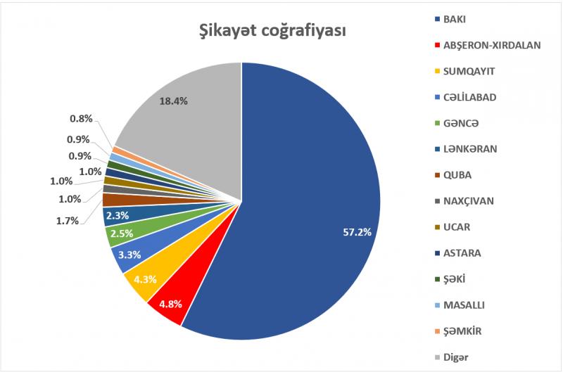 Ümumilikdə müraciətlərin 78,9%-i Bakı, Abşeron–Xırdalan, Sumqayıt, Cəlilabad, Gəncə, Lənkəran, Quba, Naxçıvan, Ucar və Astara daxil olmaqla 10 əsas bölgənin payına düşür.