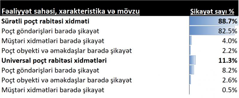 Digər müraciətlərin 4,5%-i müştəri xidmətləri, 4,8%-i isə ödənişlər, obyektlərin vəziyyəti və proqram təminatının işləkliyi ilə əlaqədar olub. Ümumilikdə müraciətlərin 88,7%-i sürətli poçt xidmətləri, 11,3%-i isə universal poçt xidmətləri üzrə qeydə alınıb.