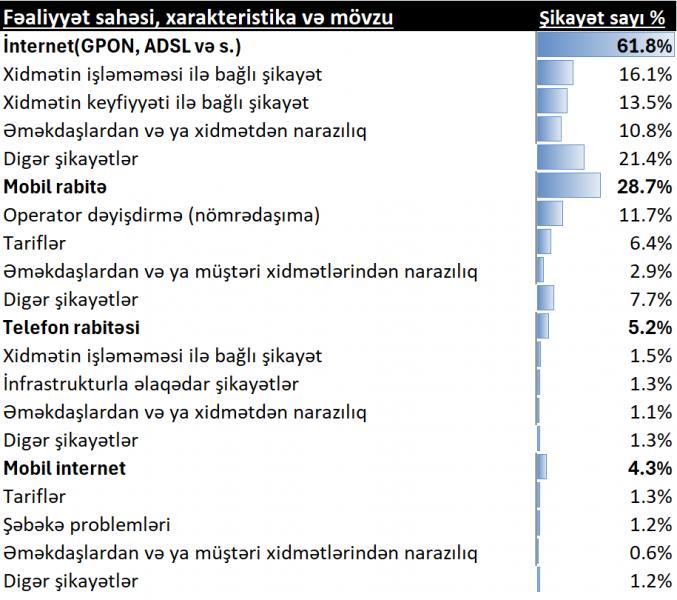 Mobil internet xidmətləri üzrə isə ən çox müraciətlər 2,5%-lə şəbəkə problemləri və tariflər, 0,6%-lə xidmət keyfiyyəti ilə bağlı qeydə alınıb.