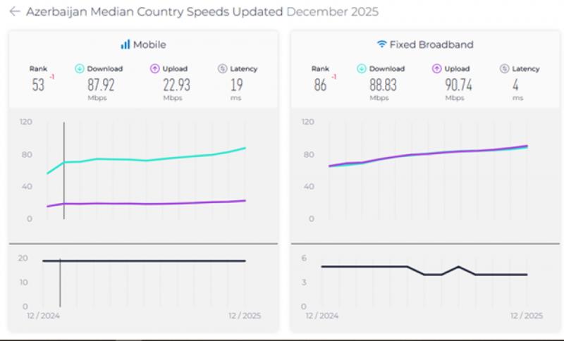 Genişzolaqlı və mobil şəbəkə keyfiyyətinin qiymətləndirilməsi üzrə qlobal şirkət olan “Ookla” dekabr ayı üzrə “Speedtest Global Index” hesabatını təqdim edib.
